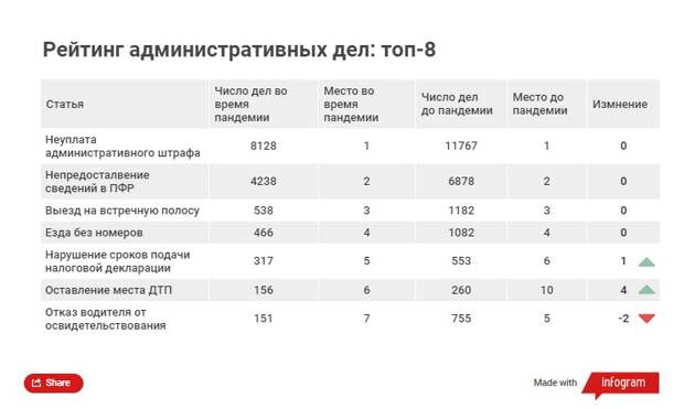 В период карантина чаще на стол к судьям стали попадать дела об оставлении места ДТП (переместились с 10-го места по популярности на шестое) и о нарушении сроков подачи налоговой декларации. А с водителями, отказавшимися пройти медицинское освидетельствование, сотрудники судов стали встречаться реже. Хотя это по-прежнему одна из самых популярных статей среди нарушителей КоАП.