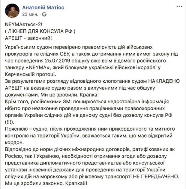 Матиос напомнил, что в соответствии с нормами действующих международных договоров, ратифицированных обеими странами, у местных силовиков нет необходимости получать согласие дипломатического представительства или консульского учреждения иностранного государства для проведения следственных действий на морском или речном транспорте, находящемся на территории Украины. «Мы это сделали законно. Точка!» — резюмировал прокурор.
