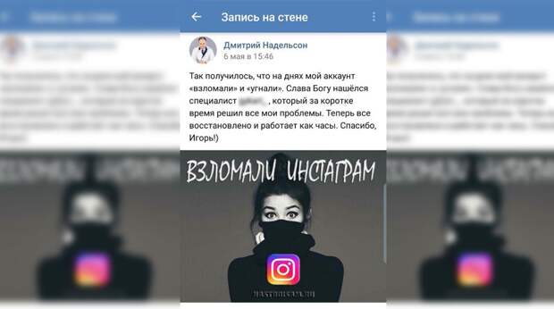 — Я являюсь «номером два» по восстановлению аккаунтов в Instagram, поэтому вы и получили огромное количество рекомендаций обо мне. У меня есть два, от силы три конкурента, но я не думаю, что их можно назвать конкурентами, поскольку мы работаем в абсолютно разной ценовой плоскости и разном информационном поле. Люди периодически записывают мои контакты, даже если все хорошо, потому что потенциально каждый может столкнуться с блокировкой. Точно так же на меня вышла Дана Борисова, например.