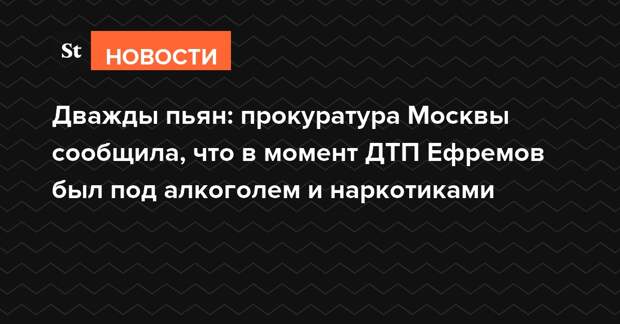 Актер Михаил Ефремов, ставший участником аварии, в которой погиб человек, в момент ДТП находился в состоянии не только алкогольного, но и наркотического опьянения. Об этом заявили в пресс-службе прокуратуры Москвы.
