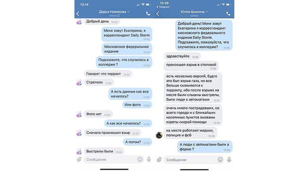ТАСС со ссылкой на свой источник написал о 70 пострадавших (ранее СМИ сообщали о 50). По данным Telegram-канала «Карточный домик: Россия», в колледж ворвались вооруженные люди, они ходили по кабинетам и стреляли в учащихся. По другим данным, стрелял лишь один человек — в Telegram-канале «Радио «Комсомольская правда» он назван несовершеннолетним. Он был убит.