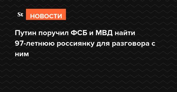 Президент России Владимир Путин поручил главам ФСБ и МВД найти 97-летнюю жительницу Ставропольского края, чтобы он мог пообщаться с ней. О желании пенсионерки встретиться с Путиным ему рассказали члены Совета по развитию гражданского общества и правам человека (СПЧ).