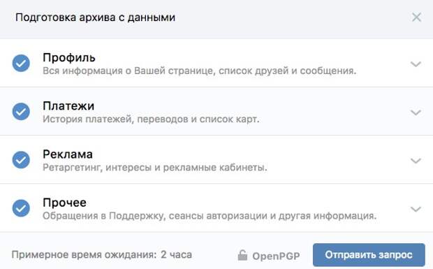 Подготовка выгрузки информации о пользователе может занимать до нескольких дней. Когда архив данных будет готов для скачивания, «ВКонтакте» пришлет уведомление. Компания предлагает пользователю получить следующие сведения: информацию о странице, списке друзей и сообщения, об истории платежей, данные для таргетинга рекламы или историю сеансов и обращения в службу поддержки.