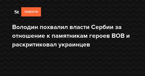 Спикер Госдумы Вячеслав Володин высоко оценил отношение властей Сербии к памятникам, посвященным подвигам героев Великой Отечественной войны. Об этом он сказал в понедельник, 3 июня, во время рабочего визита в Белград, после церемонии возложения венков к мемориалу освободителям столицы Сербии и памятнику Советскому солдату.