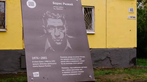 Портрет Рыжего, строчка из предсмертной записки «Всех любил. Без дураков» и цитата из его стихотворения: «Помнишь дождь на улице Титова, / Что прошел немного погодя / После слез и сказанного слова? / Ты не помнишь этого дождя!» — такую табличку поставили здесь 21 сентября при участии команды проекта «Дизайн-код Екатеринбурга» и компании «Атомстройкомплекс». Правда, о том, что она проживет недолго, местные жители подозревали уже тогда: район считается не самым благополучным, а основание, на котором держался знак, мог вырвать даже ребенок.