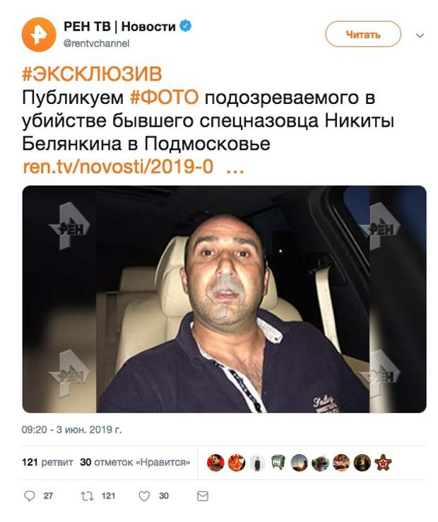 Ранее РЕН ТВ опубликовал фото человека, который, по информации телеканала, якобы является главным подозреваемым по делу об убийстве под подмосковным Красногорском бывшего бойца спецназа Белянкина. Речь идет о Григоре О., которого РЕН ТВ называет владельцем местного бара, но не уточняет, какого именно.