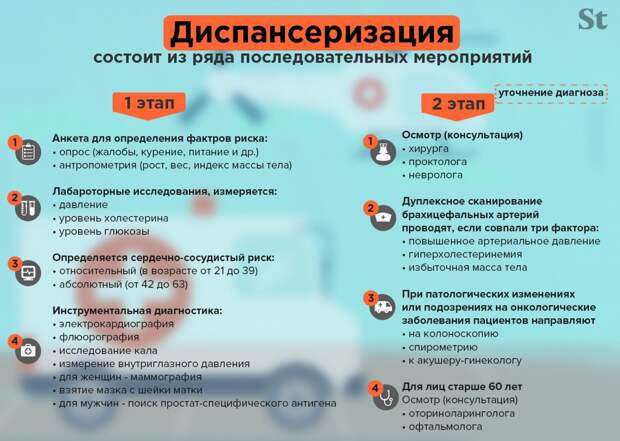 Граждан до 72 лет могут отправить на дополнительное консультирование, если они много курят, пьют, имеют ишемическую болезнь сердца, а также болезни, сопровождающиеся повышенным кровяным давлением или уровнем холестерина. За терапевтом остается и подведение итогов диспансеризации.Обследование проходит в два этапа. В первом проводится опрос (жалобы, курение, питание и др.), антропометрия (рост, вес, индекс массы тела), измеряется давление, уровень холестерина, глюкозы. Кроме того, на этом этапе определяется относительный (в возрасте от 21 года до 39 лет) и абсолютный (от 42 до 63 лет) сердечно-сосудистый риск. Проводится электрокардиография, флюорография, исследование кала, измеряется внутриглазное давление, для женщин проводится маммография, берется мазок шейки матки, у мужчин ищут простатспецифический антиген.