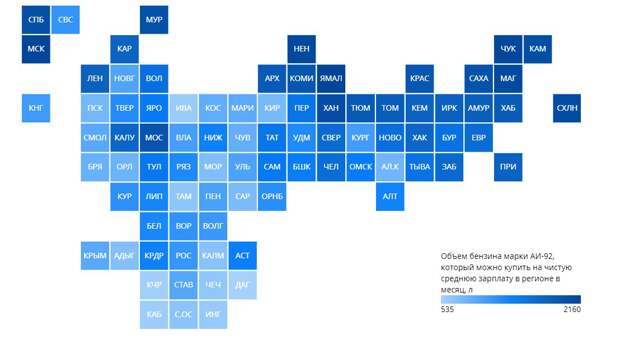 Второе место в рейтинге заняла Москва (1939 литров), третье — Чукотский автономный округ (1727 литров). В среднем по России значение доступности бензина марки АИ-92 составляет 987 литров, однако в ряде регионов страны этот показатель ниже этого уровня.Меньше всего бензина — в три-четыре раза меньше, чем в Ямало-Ненецком автономном округе — могут себе позволить жители республик Северного Кавказа и Ивановской области. На среднюю в Дагестане ежемесячную зарплату можно купить 535 литров бензина АИ-92, в Карачаево-Черкесии — 550, в Кабардино-Балкарии — 567, Ивановской области — 573 литра.