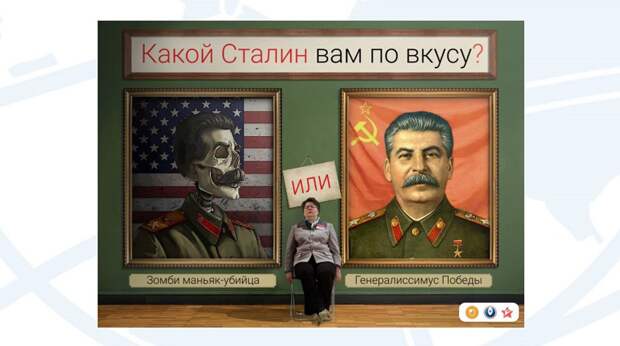 Компьютерная игрушка — как минимум, странный предмет для дискуссии, тем более образ Петра I никак не позиционирует борьбу с фейк-ньюс. Но зато следующая картинка вполне соответствует духу бесконечных споров: «Какой Сталин вам по вкусу?». Тематика исторических личностей благодатна всегда, но при чем здесь заявленный лекционный посыл «Россия и мир: образ будущего»?