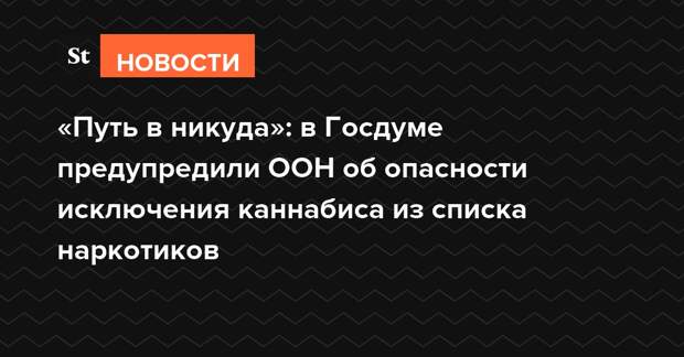 Комиссия ООН проголосовала за то, чтобы исключить каннабис из Списка IV Единой конвенции о наркотиках 1961 года — перечня веществ, требующих наиболее жесткого контроля. Заместитель главы комитета Госдумы по охране здоровья Николай Говорин назвал такое решение ООН сомнительным и ошибочным, отметив, что на Западе в будущем о нем еще пожалеют.