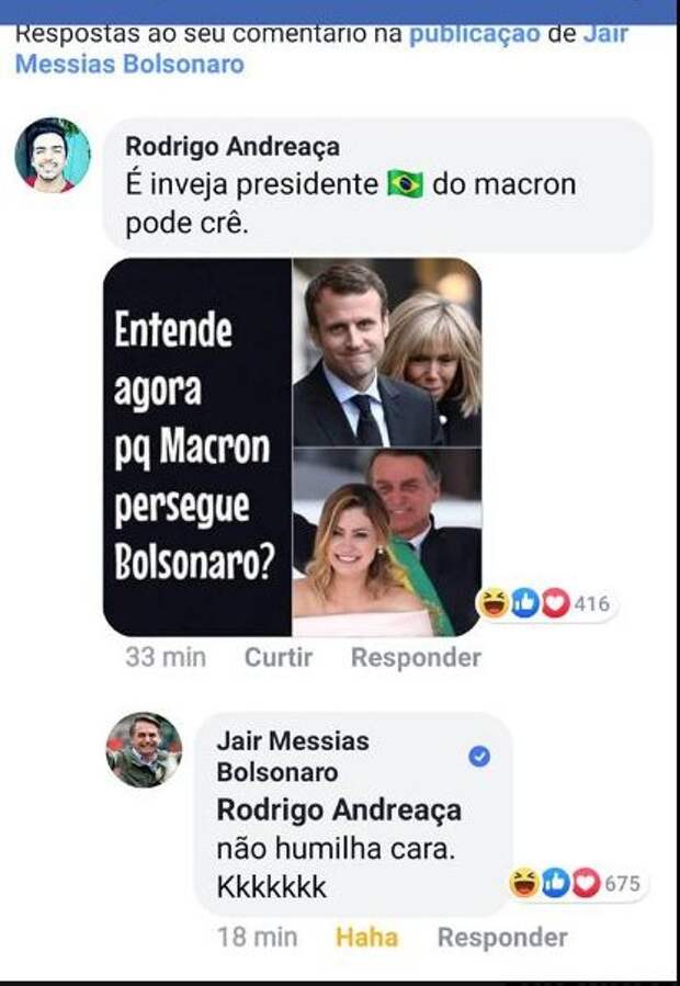 В конфликте принял участие министр образования Бразилии Абрахам Вейнтрауб, который назвал Макрона «оппортунистическим подонком».Скандал разразился после поста, который разместил пользователь Родригу Андреас. На фоне спора двух лидеров по поводу пожаров в лесах Амазонии бразилец опубликовал две фотографии: на одной президент Бразилии и его 37-летняя жена, а на другой — Макрон и его 66-летняя супруга. Андреас подписал: «Теперь понятно, почему Макрон преследует Болсонару». Одним из комментаторов оказался бразильский лидер, который написал: «Не унижай человека. Ха-ха».