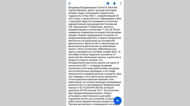 «Обращения артистов Госхора имени А.В. Свешникова в издание Daily Storm, на мой взгляд, вызваны неуверенностью части аттестуемых перед объективной аттестацией, проводимой в учреждении, — пишет Дмитряк. — В связи с чем, я считаю, что обращения к вам некоторых аттестуемых является попыткой искажения целей аттестации».