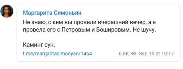 По ее словам, она попросила их показать паспорта, а потом спросила: «Вы кто?»«Не знаю, с кем вы провели вчерашний вечер, а я провела его с Петровым и Бошировым. Не шучу», — пишет Симоньян в Telegram-канале.