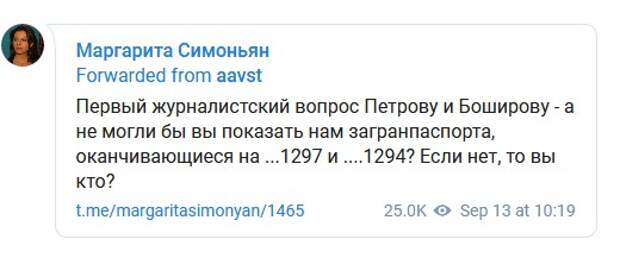 «Первый журналистский вопрос Петрову и Боширову — а не могли бы вы показать нам загранпаспорта, оканчивающиеся на ...1297 и ...1294? Если нет, то вы кто?» — написал Telegram-канал avast, что вызвало удивление у Маргариты Симоньян. «У тебя что, жучки в моем офисе? Я дословно сначала попросила их показать паспорта, а потом спросила: «Вы кто?» — сообщила она.