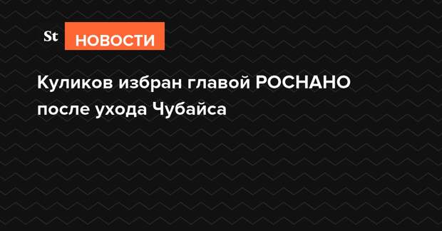 Совет директоров РОСНАНО избрал бывшего замглавы коллегии Военно-промышленной комиссии Сергея Куликова главой компании после ухода Анатолия Чубайса. 3 декабря Чубайс объявил, что работает последний день в госкорпорации, не уточнив, чем будет заниматься дальше.