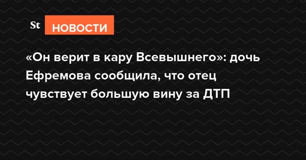 Накануне вечером в центре Москвы Ефремов на своем внедорожнике столкнулся с фургоном. Получивший серьезные травмы водитель фургона умер в больнице.«Он чувствует большую свою вину, потому что он, во-первых, православный человек, человек религиозный, который верит в Бога и верит в кару Всевышнего. И в данный момент у него еще не очень хорошее физическое состояние, потому что он очень сильно волнуется за произошедшее и за семью погибшего», — сказала Анна-Мария Ефремова телеканалу «360».