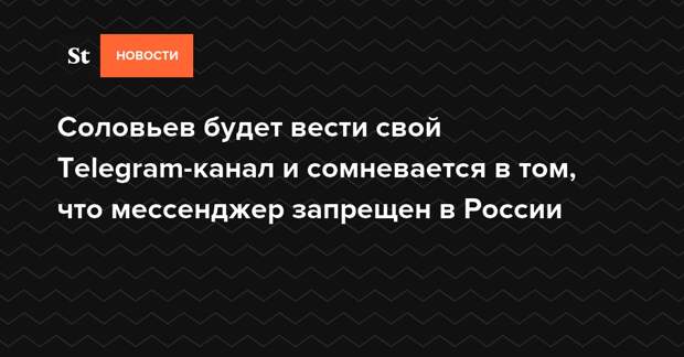 Телеведущий Владимир Соловьев рассказал, зачем завел свой Telegram-канал, и усомнился «запрещенности» мессенджера на территории России. Свои первые два сообщения в канале он посвятил ситуации с арестом журналиста «Медузы» Ивана Голунова.