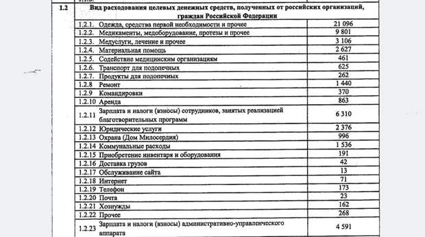 На юридические услуги было потрачено 2,37 миллиона рублей (из 57,4 миллиона рублей всех расходов в 2017 году). На медикаменты ушло значительно больше — 9,8 миллиона, на медицинские услуги — 3,1 миллиона. Самые же серьезные расходы прошли по графе «одежда, средства первой необходимости и прочее» — 21,1 миллиона рублей.