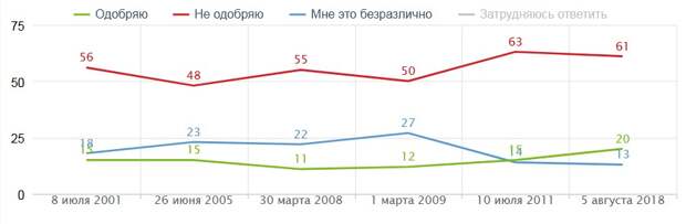 Кроме того, 31% участников июльского опроса предпочитают уже воздерживаться от значительных трат. В марте так были готовы поступить 19% опрошенных.В начале августа опрос, проведенный «Левада-Центром», показал, что около 37% россиян готовы принять участие в акциях протеста против пенсионной реформы. 71% граждан назвали своим самым желанным решением по этому вопросу — ее полную отмену. В протестных акциях не готовы участвовать 53% опрошенных, еще 10% затруднились с ответом.