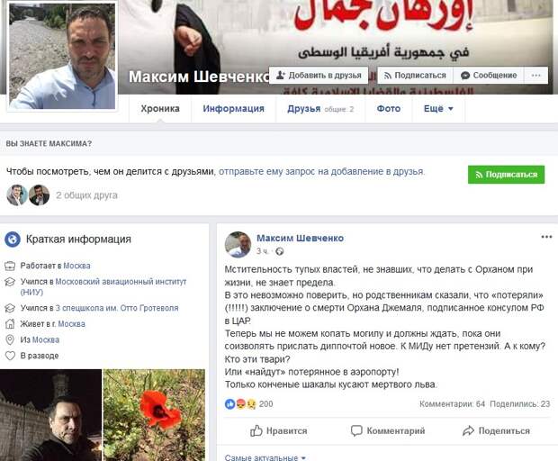 Общественный деятель и телеведущий Максим Шевченко написал на своей странице в Facebook достаточно резкий пост. В нем он обвиняет российские власти в халатности. По его словам, во время доставки тела погибшего в Центральноафриканской Республике (ЦАР) журналиста Орхана Джемаля было утеряно заключение о его смерти, подписанное консулом России в ЦАР.