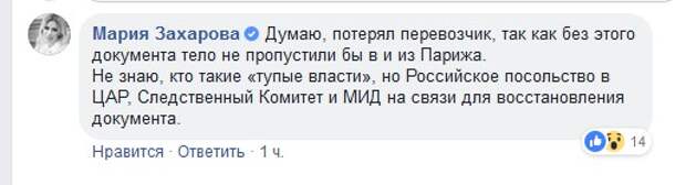 «Думаю, потерял перевозчик, так как без этого документа тело не пропустили бы в и из Парижа, — написала Захарова. — Не знаю, кто такие «тупые власти», но Российское посольство в ЦАР, Следственный Комитет и МИД на связи для восстановления документа».