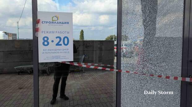 Чтобы оценить спрос, я поехал в крупные строймаркеты города. Сначала зашел в магазин сети «Стройландия». На входе гостей встречает разбитый стеклопакет с мелким отверстием — похоже, недавно рядом был прилет.