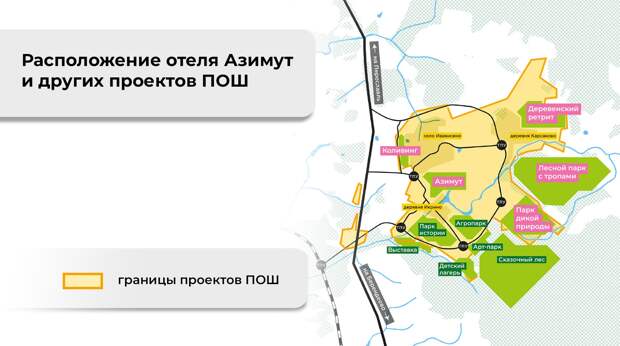Проект отеля разработала компания «ПОШ» Петра Шуры. Согласно данным «СПАРК-Интерфакс», эта организация была ликвидирована в 2020 году, однако, судя по соцсетям, фирма с таким названием до сих пор функционирует и планирует осуществление еще нескольких проектов в Переславском районе вокруг отеля Azimut. Как пишет сама компания, для осуществления этих проектов был необходим новый генплан района, а также изменение вида разрешенного использования земельных участков. Тут же в блоге ПОШ сообщается: «Наконец-то внесли изменения в генплан. Нам перевели 200 гектаров в рекреацию, которых хватит на парк дикой природы, но на другие парки уже не хватает».