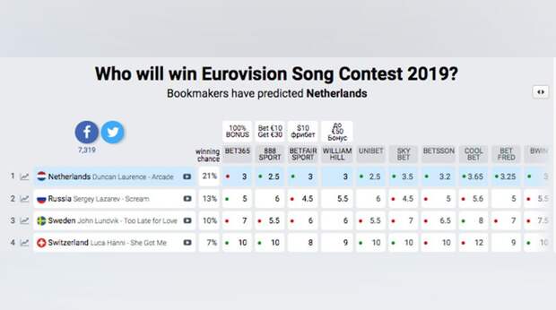 Как следует из таблицы, приведенной на сайте конкурса, пока самым ярким участником считается голландец Дункан Лоренс: его шансы на победу оцениваются в 21%. У Лазарева — 13%. На третьей строке с показателем 10% находится шведский исполнитель Джон Лундвик.