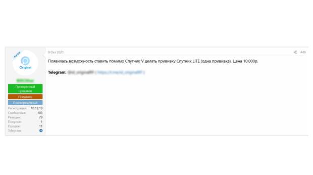 Актуальная стоимость услуги, судя по объявлениям на теневых форумах, составляет 9000 — 10 000 рублей, тогда как в июне цена варьировалась от 10 000 до 20 000 рублей. Некоторые селлеры предоставляют выбор: фейковый укол «Спутником V» или «Спутником Light». Цена на обе услуги одинаковая — около 10 000 рублей.