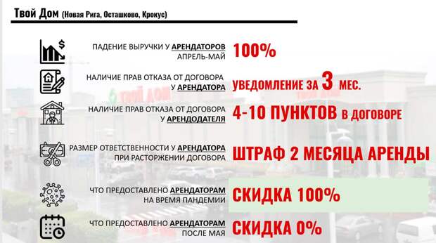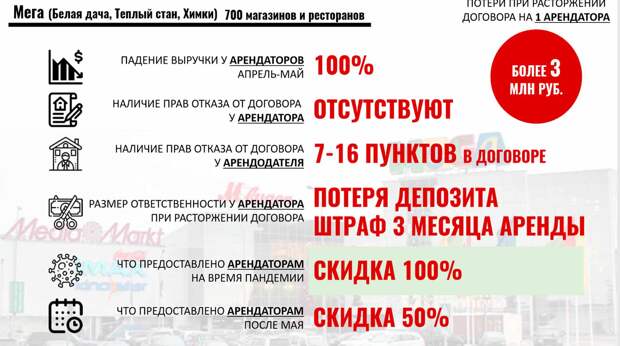 При этом он сообщает, что после двух месяцев переговоров со всеми торговыми центрами, где есть магазины компании, подписано только одно дополнительное соглашение о новых условиях работы в период простоя и до конца года.