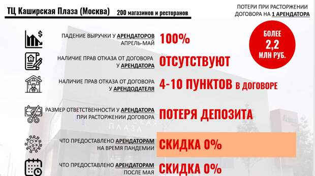 «Около 20% ТЦ нам даже не отвечают. Нет ответов даже по условиям в эти два месяца. Мало того семь арендаторов нам просто отказывают в доступе к товару в течение всего апреля и мая. Это несмотря на наши попытки заработать хоть что-то для онлайн продаж. Зато письма о необходимости оплатить аренду мы получаем регулярно. Зачастую в процессе переговоров нам предлагаются дополнительные обременения: дают скидку на один месяц после открытия, а за это просят продлить на год действующий договор с допандемийными ставками и условиями», — рассказывает он.