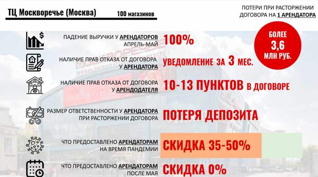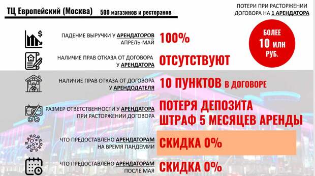 Представители Союза составили список, в который вошли торговые центры «Европейский», «Атриум», «Каширская Плаза», «Метрополис», «О’Кей», «Москворечье», «Галерея» (Санкт-Петербург), «Афимолл Сити», «Вегас». Все они отказываются предоставить арендаторам скидку после мая, а некоторые — даже не идут на уступки во время введенных из-за пандемии жестких ограничений на работу торговых точек. При этом расторгнув договор, арендатор потеряет несколько миллионов рублей. Самые большие потери в рейтинге несут арендаторы ТЦ «Метрополис» — при максимальных санкциях речь может идти об убытках вплоть до 18 миллионов рублей.