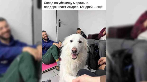 На снимках — шутливый плакат с просьбой «укрываться в складках местности» и протягивающий лапу большой белый пес. Это — их сосед по убежищу.