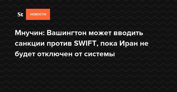 Министр финансов США Стивен Мнучин заявил, что Вашингтон провел переговоры с системой межбанковской передачи информации SWIFT об отключении Ирана от этой системы. Он уточнил, что это необходимо для соблюдения санкций, введенных Соединенными Штатами против Тегерана.