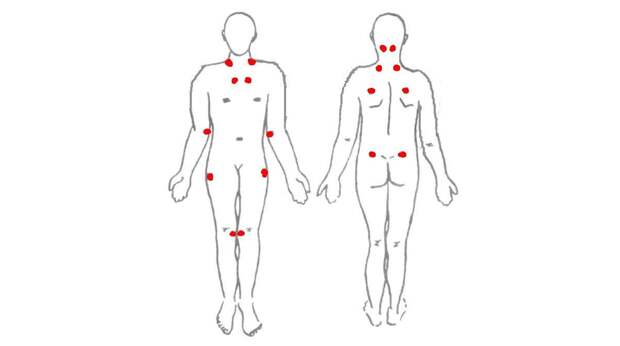 Точный диагноз девушке поставили только спустя полтора года. Если набрать в поисковике слово «фибромиалгия», одной из первых появится картинка про 18 триггерных точек. Если боль возникает при нажатии на 11 из них, можно смело подозревать фибромиалгию. Казалось бы, простая инструкция к диагностике.