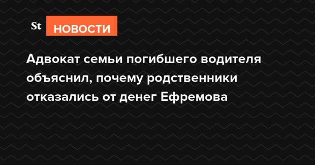 Об этом заявил адвокат потерпевшей стороны Александр Добровинский. Он отметил, что предложит родственникам подать гражданский иск о моральном ущербе. По словам юриста, он взялся защищать семью погибшего, поскольку не хочет, чтобы Ефремов избежал наказания за пьяную аварию.«Брат погибшего Сергея мне сказал, что они ждали хотя бы извинений от близких Ефремова. Семья приняла решение не брать ни одной копейки, в случае если какие-то деньги будут предложены им. Одна фраза тронула меня до сердца: "Жизнь нашего брата бесценна, и деньгами ее купить нельзя», — заявил Добровинский в эфире телеканала «Россия 1».