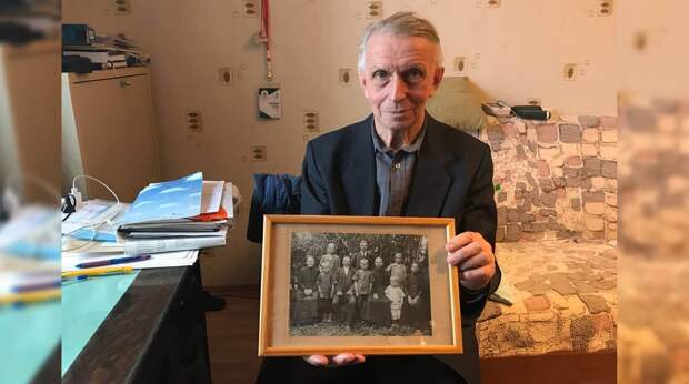 На нем надет классический костюм в тонкую полоску. Большие голубые глаза всегда участливо смотрят на собеседника. Он берет в руки старинную фотографию, на которой изображена многодетная семья: