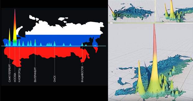 Москва для России — все тот же перегруженный центр. Вот так сегодня выглядит диаграмма стягивания человечества и экономического капитала: