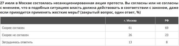 В организованной оппозиционерами акции, по разным оценкам, приняли участие от 3,5 тысяч человек.«Согласны с тем, что в подобных ситуациях власть должна действовать в соответствии с законом, даже если приходится применять жесткие меры, более половины (61%) жителей Москвы (против 26%). Показатели среди россиян: 69 и 23% соответственно», — отметили в центре изучения общественного мнения.