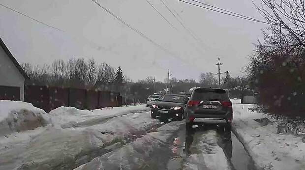 Ледяная колея на въезде в Гостищево тянется так ровно и глубоко, будто по дороге проложили рельсы. Машину кидает на замерзших кочках. Чтобы разъехаться, водителям приходится выскакивать на обочину. Одна из машин уже «притерлась» к другой — попытка выбраться из колеи закончилась ударом.