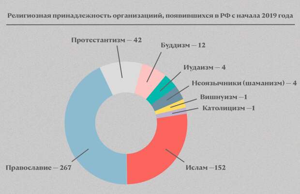 Сейчас в России зарегистрированы 31 392 религиозные организации более 60 различных конфессий. За последние пять лет появилось 2927 религиозных организаций, а с начала 2019 года — 483 (все данные приведены по состоянию на 30 сентября 2019 года).