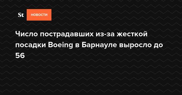 Число пострадавших из-за жесткой посадки самолета Boeing, у которого 25 сентября загорелась стойка шасси при посадке в аэропорту Барнаула, увеличилось до 56 человек. У двоих пассажиров переломы лодыжек, у третьего возможен перелом позвоночника.